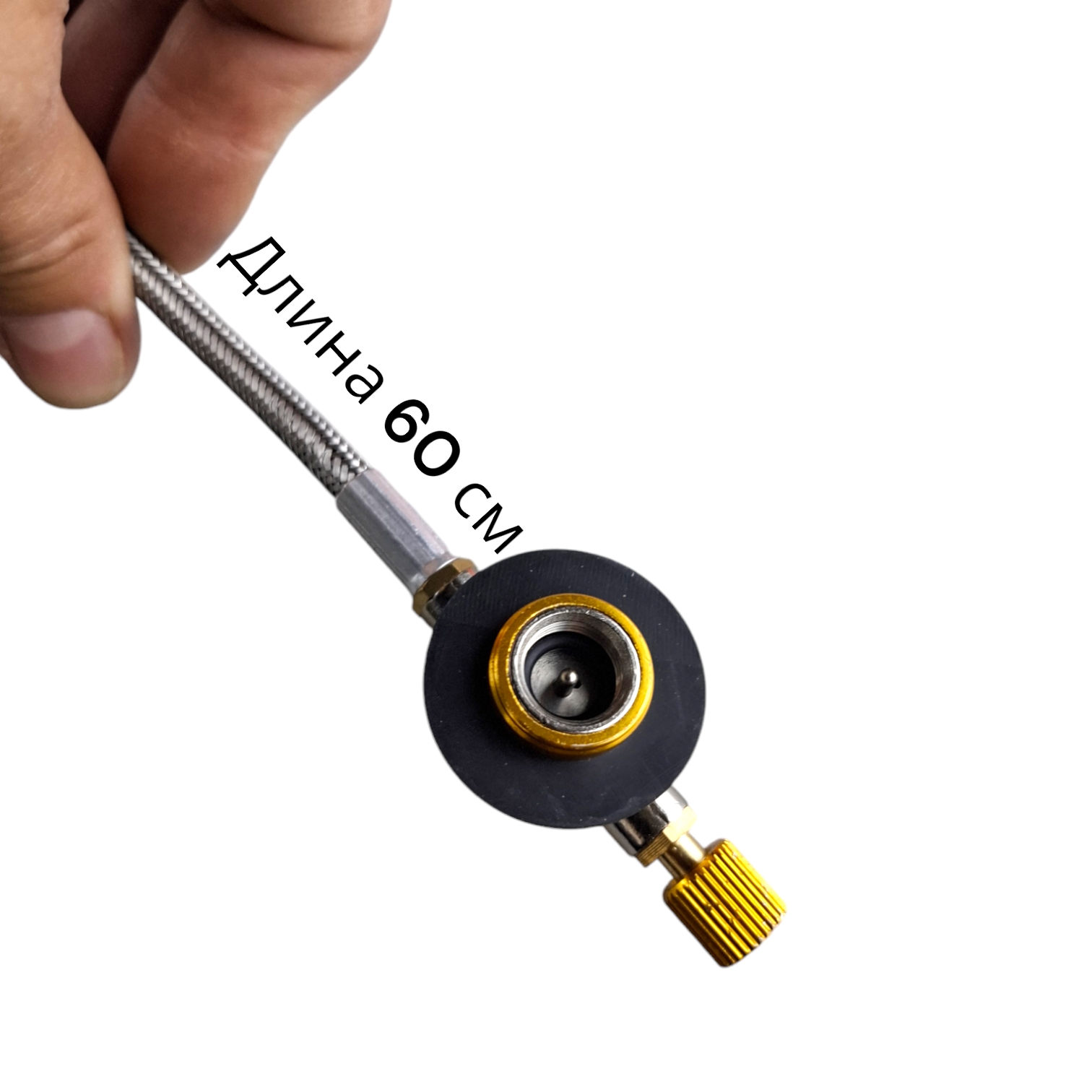 Газовый шланг длиной 60 см усилен стальной оплеткой для повышенной долговечности и безопасности. Основные элементы изготовлены из латуни, что обеспечивает отличную теплопроводность и устойчивость к коррозии.
