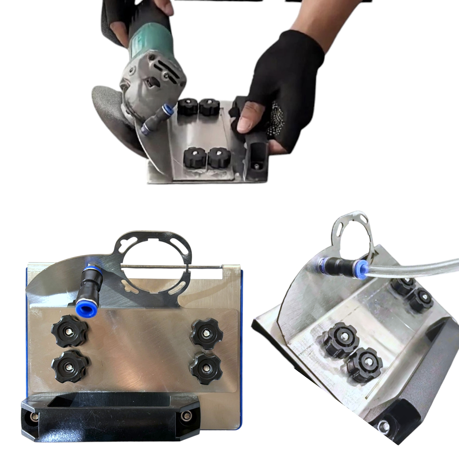 Подставка стабилизирует УШМ, обеспечивая плавное движение и минимизируя сколы. Удобная рукоять не скользит и не вибрирует в руке. Универсальный крепеж фаскоснимателя для УШМ подходит для большинства болгарок (Makita, Bosch, DeWalt и др.)