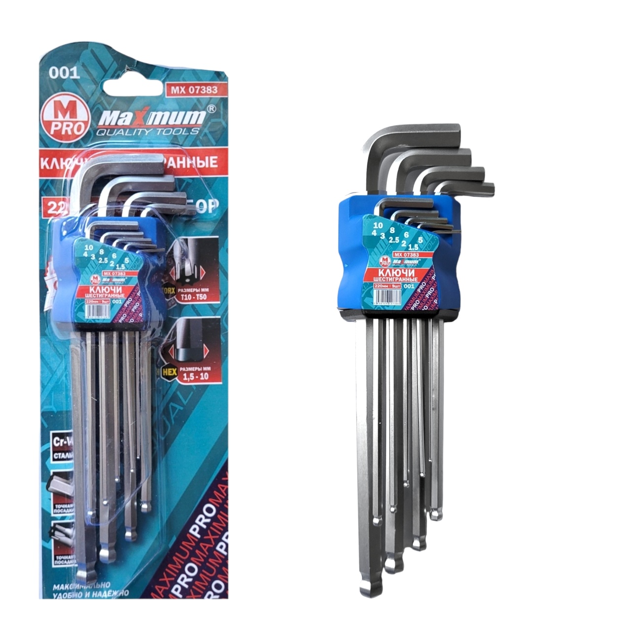 Набор шестигранных ключей от бренда Maximum состоит из 9 предметов в складном открытом футляре для хранения. Маркировка позволяет быстро выбирать нужный ключ. Двухсторонние шестигранники выполнены из высокопрочной стали с антикоррозийным покрытием.