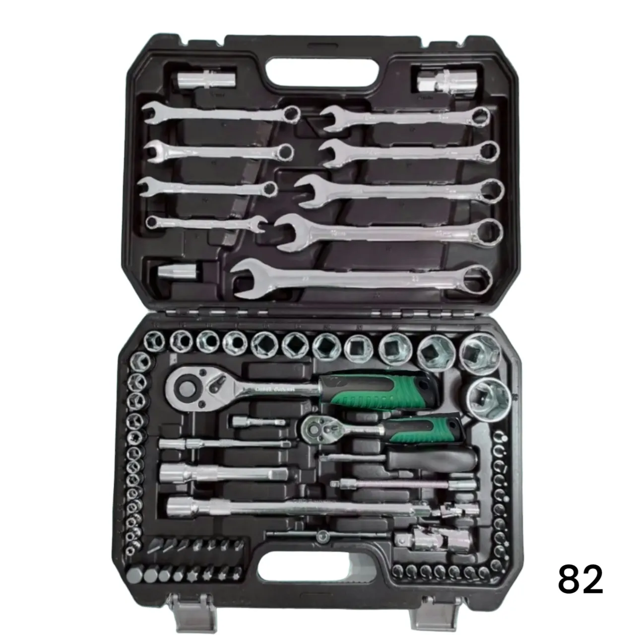 Универсальный набор инструментов с 12-гр. головками 1/2"DR и 1/4"DR используется в автомастерских для работ с различными видами крепежа. Набор состоит из 82 предметов, на каждом из которых стоит маркировка с размером. Набор выполнен из высокопрочной стали, на поверхность инструментов нанесено хромованадиевое покрытие, которое придает изделиям высокую коррозионную стойкость и механическую прочность. Для надежного хвата и комфортной работы ключи-трещотки оснащены удобными двухкомпонентными рукоятками. Набор инструментов для авто поставляется в кейсе из ударопрочного пластика, что гарантирует безопасное хранение и транспортировку. Инструменты внутри кейса компактно расположены и надежно закреплены. Специальная застежка предотвращает выпадение инструментов из кейса. Комплектация набора представлена на фото 4.
