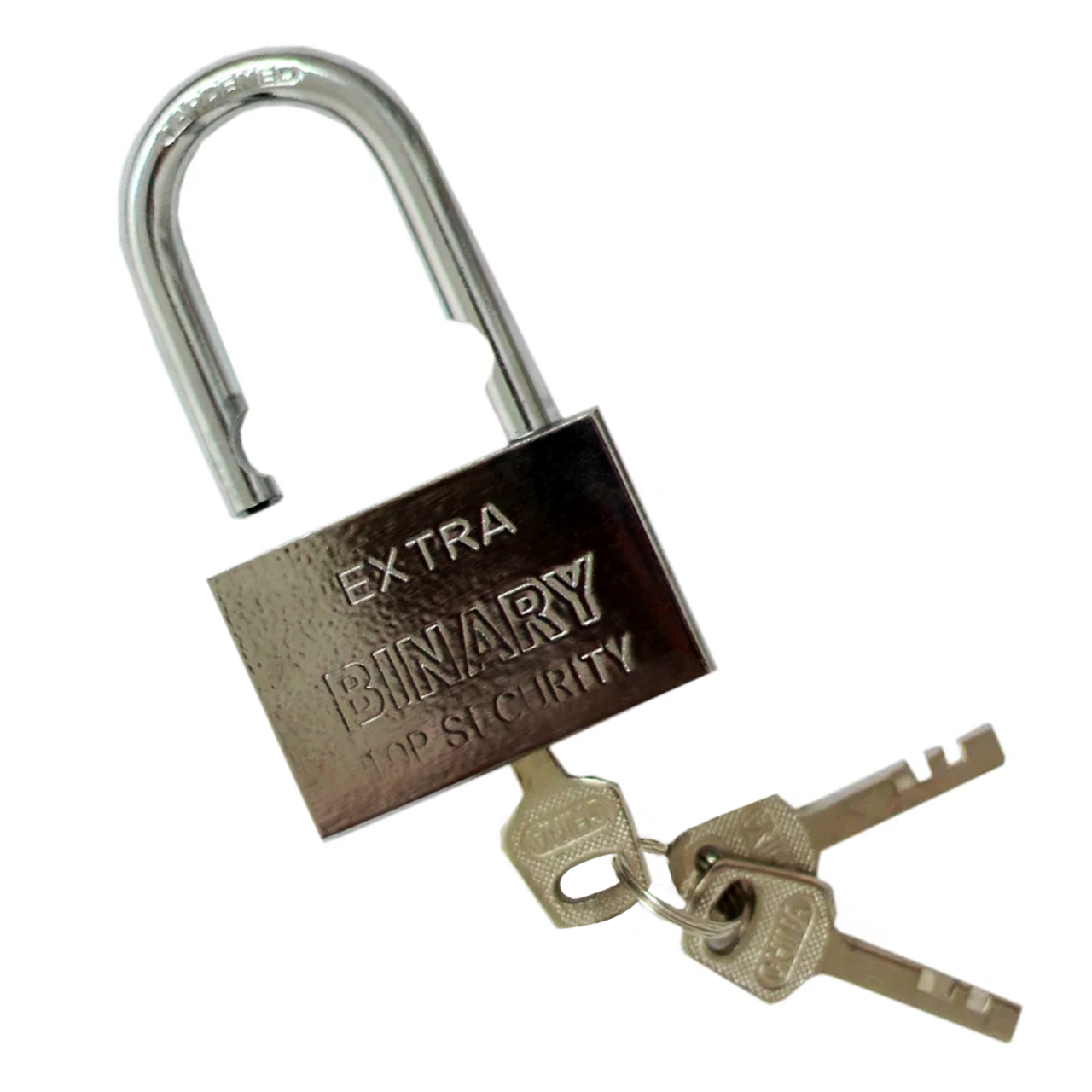 Замок 50 мм «BINARY» навесной из серии EXTRA имеет стальной корпус надежно защищенный хромированным покрытием, которое не ржавеет и легко очищается от грязи.